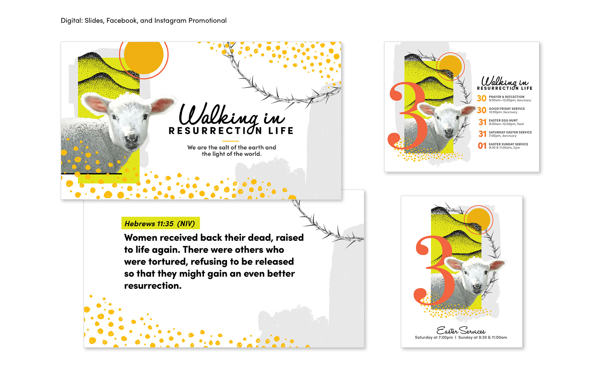 2019: The Time is Now As a church body, celebrating the Good News of Jesus is our mission. Each element symbolizes events leading up to Easter as well as after. The Crown of Thorns emphasizes what Christ did and acts as a clock, encouraging one to know who He is and to have a relationship with Him. The dove represents the Holy Spirit, while the clouds and smoke represents Jesus’ resurrection. 2018: Walking in Resurrection Life The direction was to incorporate collage symbols and elements that represent the energy and celebration of Christ's resurrection.