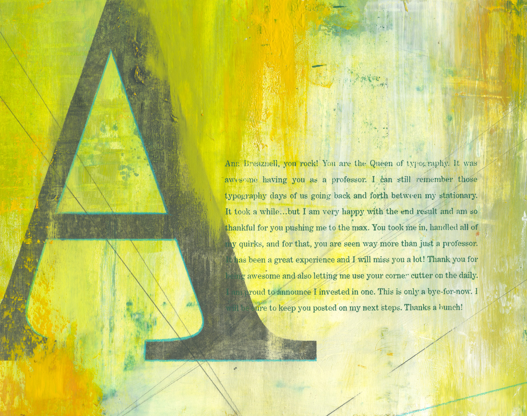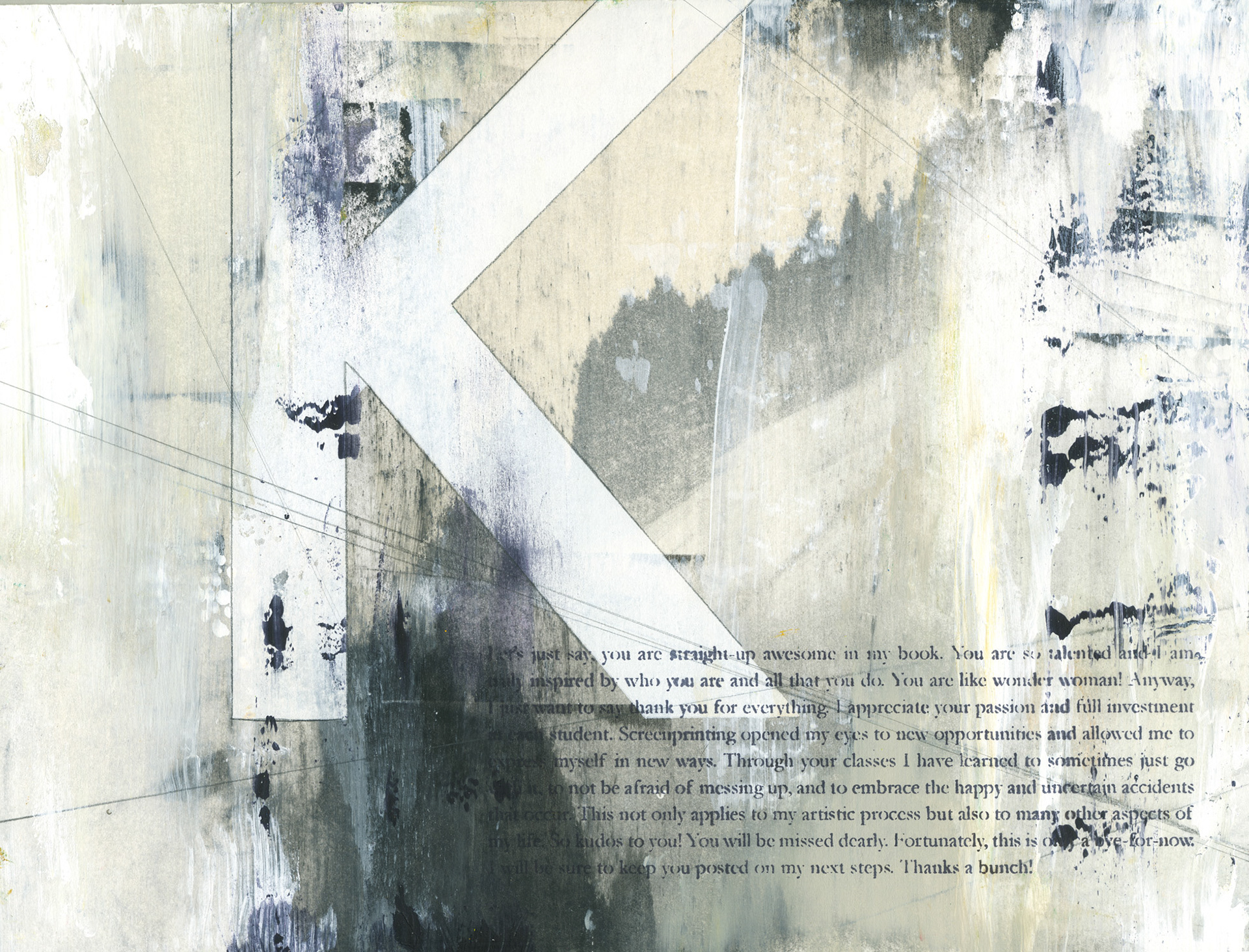 Saint Rose has amazing professors for their art program. You aren't just a number to them. I had the wonderful opportunity to be mentored and taught by insightful and personal professors that wanted to see each one of their students grow and excel. I used my screen printing style to incorporate their first initial, favorite colors, and a personal letter to express my gratitude to them.